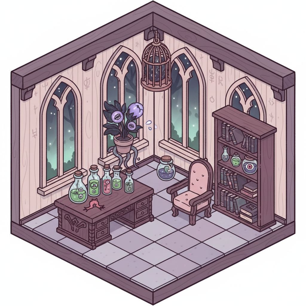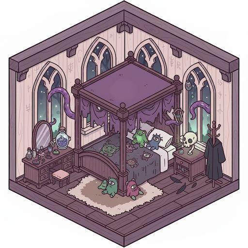 植物の研究をしている魔女の寝室。独特の趣味だけど可愛いもの好きでぬいぐるみをいっぱいベッドに置いている。