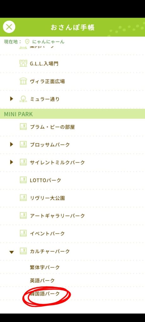 おさんぽからおさんぽ手帳を開き、韓国語パークへ行きます。