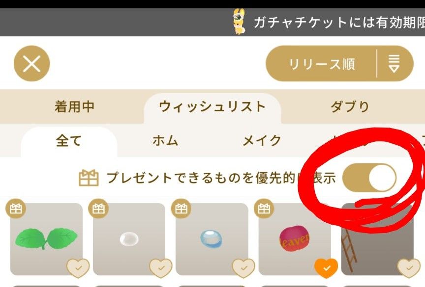 「プレゼントできるものを優先的に表示」をオンにすると相手が欲しくて自分が渡せるものが最初の方に出てきます。