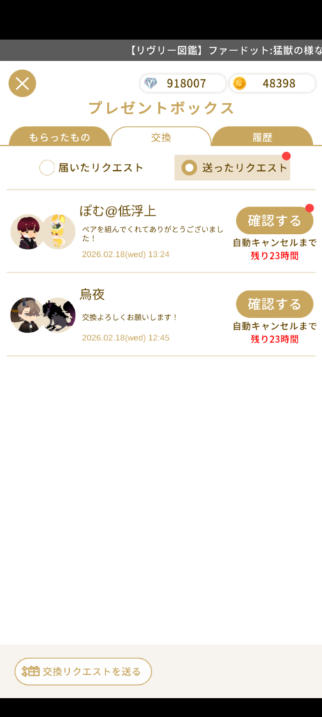 ちなみに送ったリクエストは「プレゼント」の中の送ったリクエストから確認できます。
