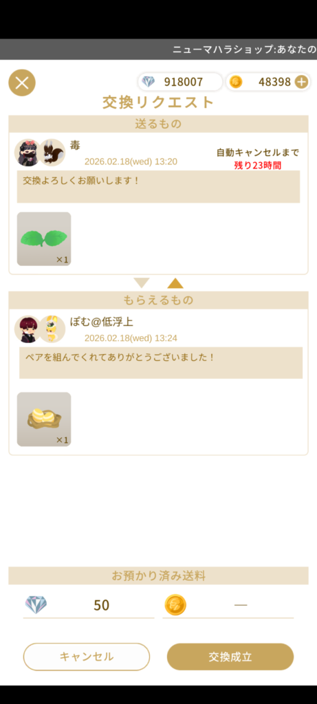 交換成立を押して完了です。