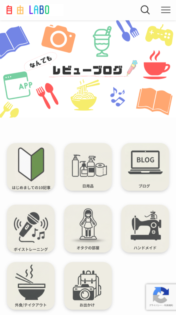当ブログのトップページがこちらなんですが(読む頃には変わってるかも)、メインビジュアルの下にあるアイコン集の作り方を今回は解説していきます。