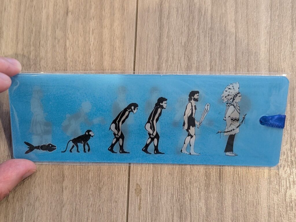 左の栞は見る角度によって絵柄が変わるもので、人類の進化・発展の歴史が描かれています。